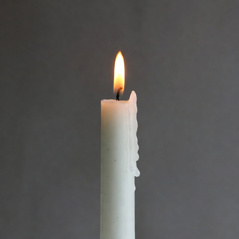burning candle, candlelight, dripping wax, fire, flame, gray background, isolated background, lit candle, melt, tall candle, wax, white candle, wick, candle