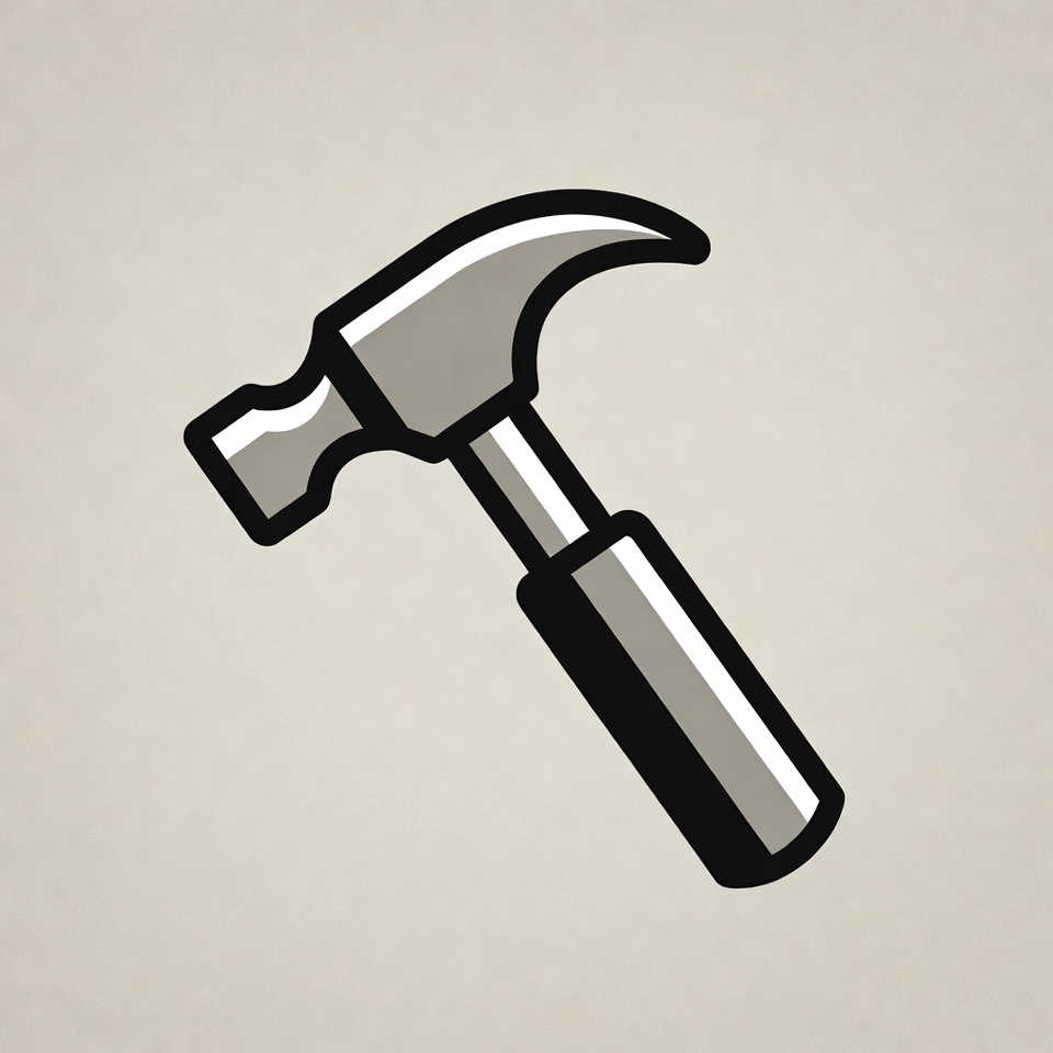 A simple cartoon illustration of a claw hammer on a plain beige background. The hammer features a silver head with a curved claw and black outlines. The handle is gray with a black grip.