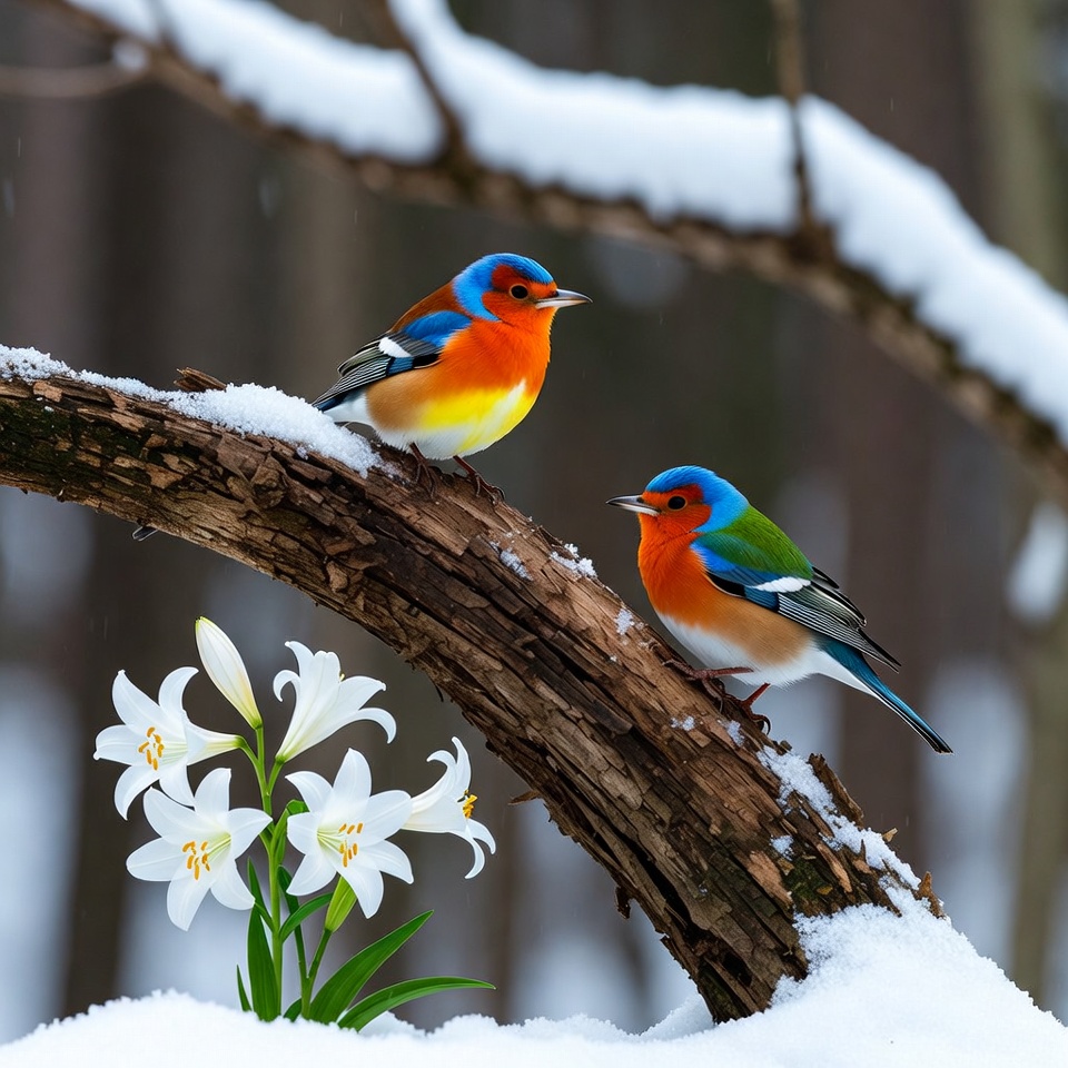 Two vibrant birds with blue, orange, green, and yellow feathers perch closely on a snow-covered wooden branch. White lilies bloom nearby in the snowy forest setting. Snow dusts the branches and ground around them.