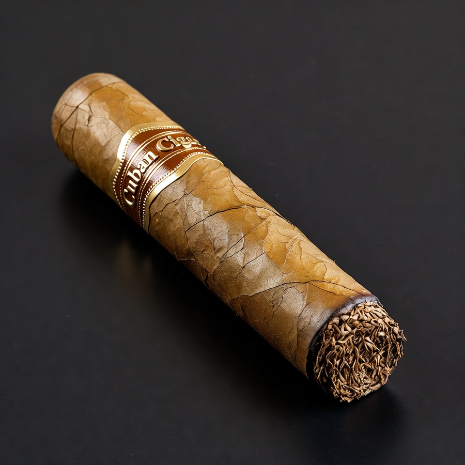 A premium Cuban cigar with a textured brown wrapper lies angled on a black background. It features a gold-trimmed label reading 'Cuban Cigar' along the side. The lit end shows glowing embers and loose tobacco fibers.