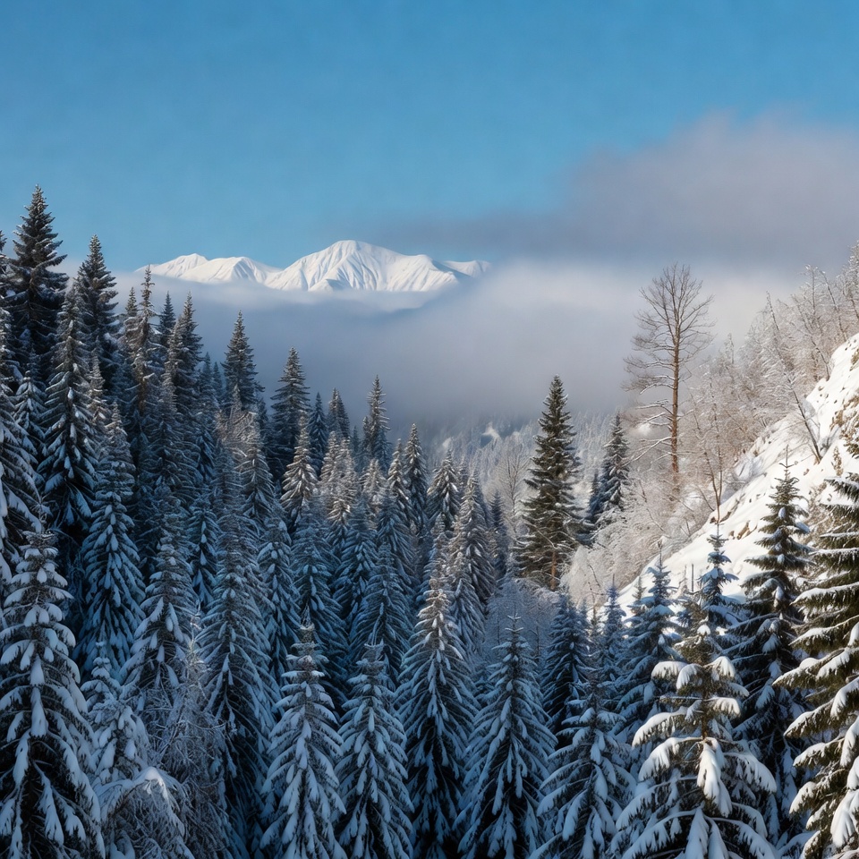 A dense forest of pine trees covered in snow stands in the foreground under a clear blue sky. Majestic snowcapped mountains rise in the background, partially shrouded in mist and clouds. Bare deciduous trees add contrast on the snowy hillside.