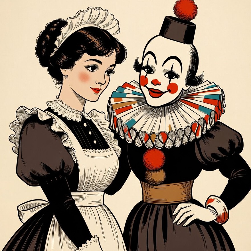 A vintage-style illustration features a young woman dressed as a maid in a black dress with white apron and cap standing beside a clown with white face paint, red nose, and colorful ruffled collar. The maid has brown hair in an updo and a gentle smile, while the clown has a wide red smile and pom-pom hat. Both figures are posed confidently against a plain background.