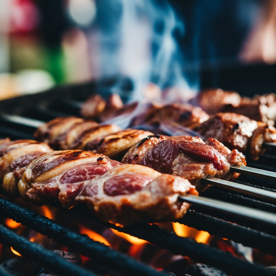 bbq, blurred background, charcoal grill, cooking, crowd, fire, flames, food, grill marks, grilling, juicy meat, kebabs, marinade, meat skewers, outdoor, party, savory, skewers, smoke, summer, barbecue