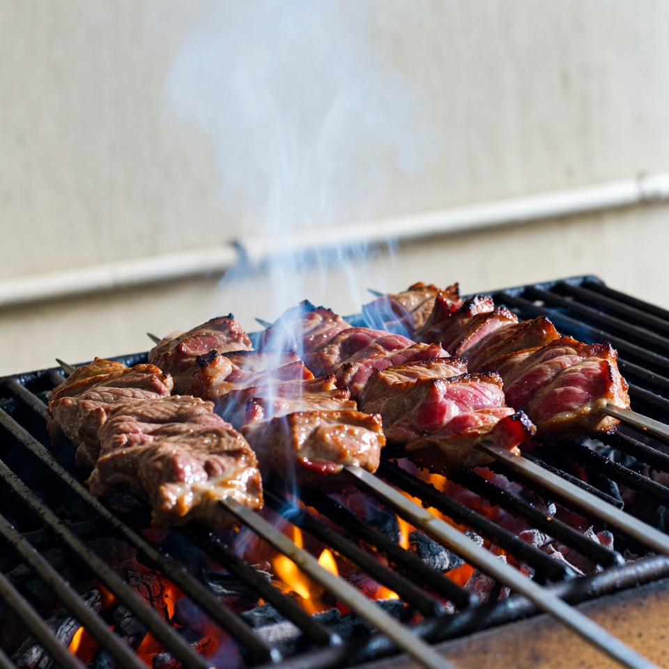 Skewered meat grilling on barbecue