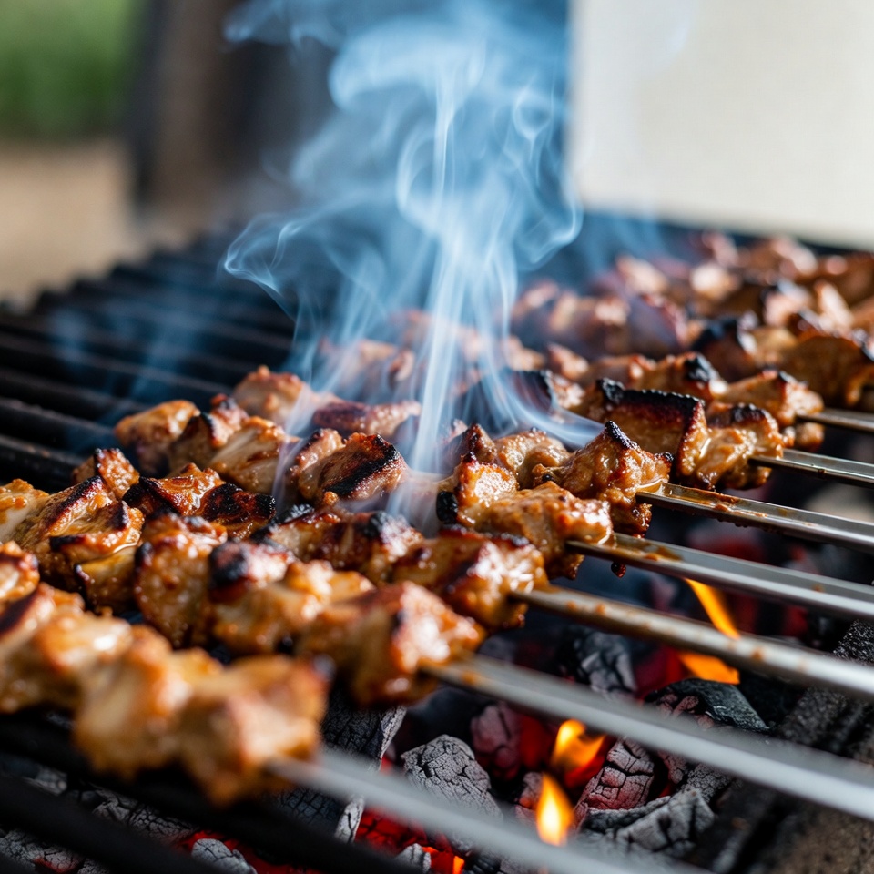 BBQ, coals, cooking, cuisine, fire, flames, food, grill, grilling, heat, kebabs, marinade, meat, outdoor, roasting, savory, shish kebab, sizzle, skewers, smoke, stainless steel, summer, barbecue