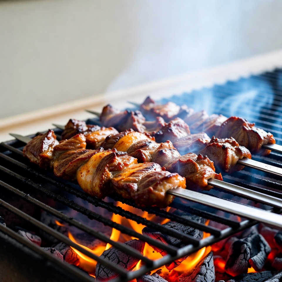 barbecue, barbecue grill, bbq skewers, charcoal grill, cooking, flame grilled, food, grill, hot coals, juicy meat, kebabs, marinated meat, meat chunks, outdoor cooking, shish kebab, sizzling meat, skewers, smoke, steam, grilled meat