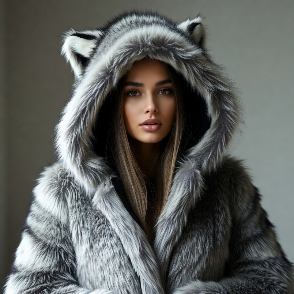 A young woman with long brown hair peers from beneath a fluffy gray fur hood featuring large wolf ears. She has striking green eyes and full lips, gazing directly at the camera. The fur jacket is open, revealing her figure against a plain background.