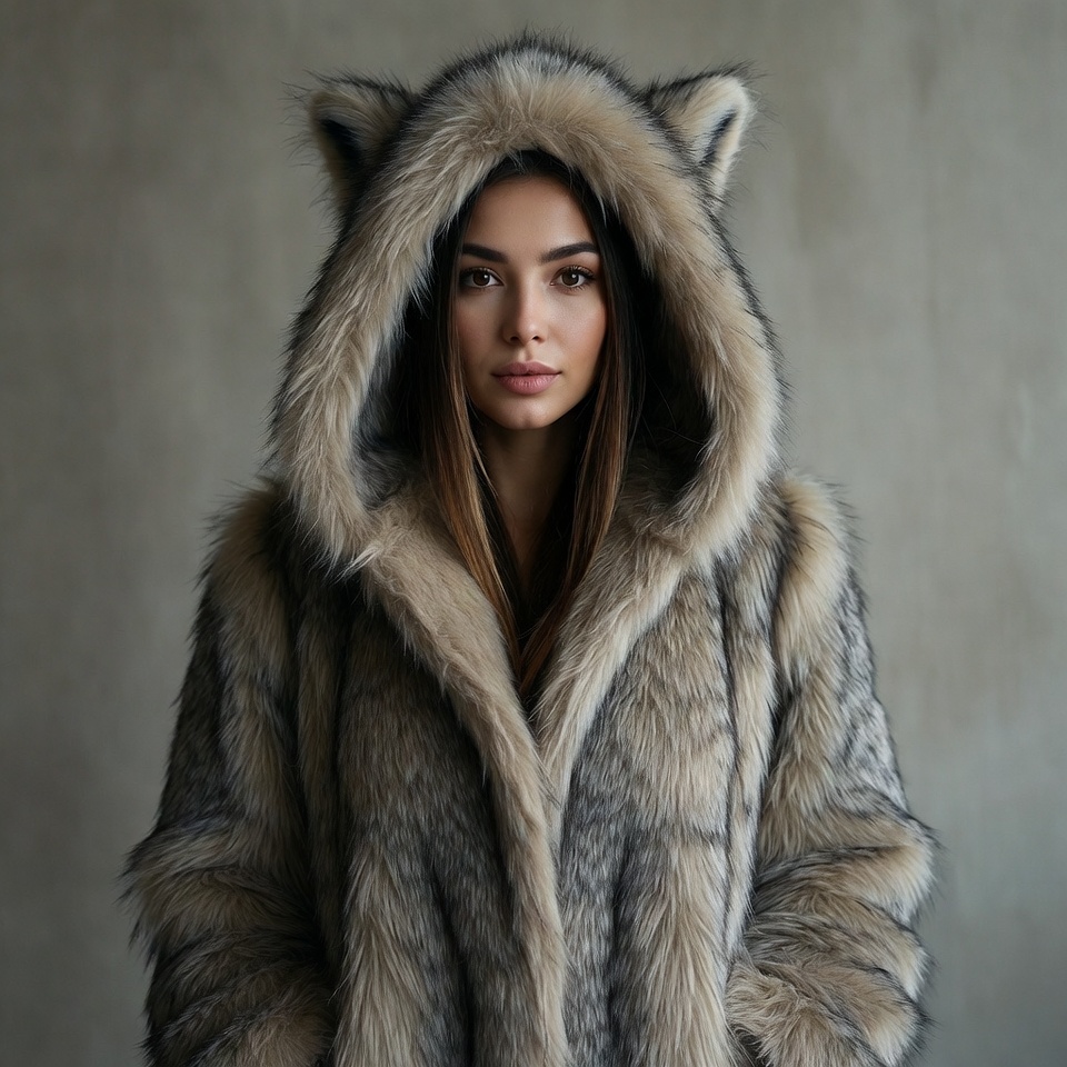 A young woman with long dark hair and striking features wears a luxurious furry hood with prominent cat ears. The hood is light brown with gray tones and frames her face closely. She stands against a plain gray background, looking directly at the camera.