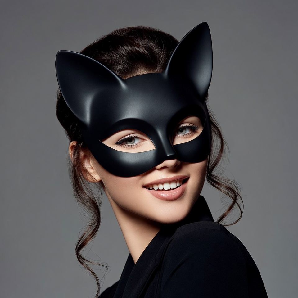 A young woman with dark curly hair wears a glossy black cat mask covering her eyes and nose. She smiles with red lips visible below the mask and has her hair styled in an updo. She poses against a gray background, dressed in a black outfit.