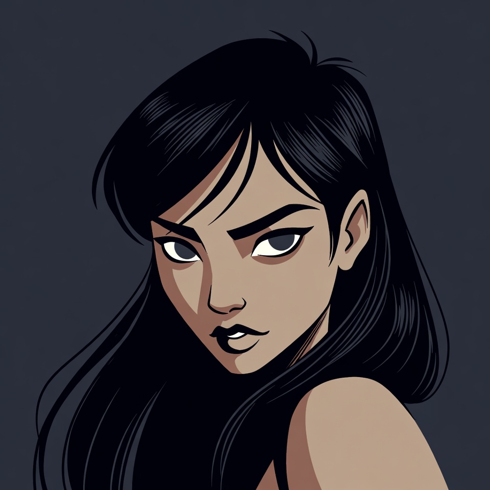Asian, anime style, black hair, bold lines, dark background, digital art, female, fierce look, glare, illustration, intense expression, isolated, long hair, portrait, sharp eyes, side glance, stern face, vector art, young woman, woman