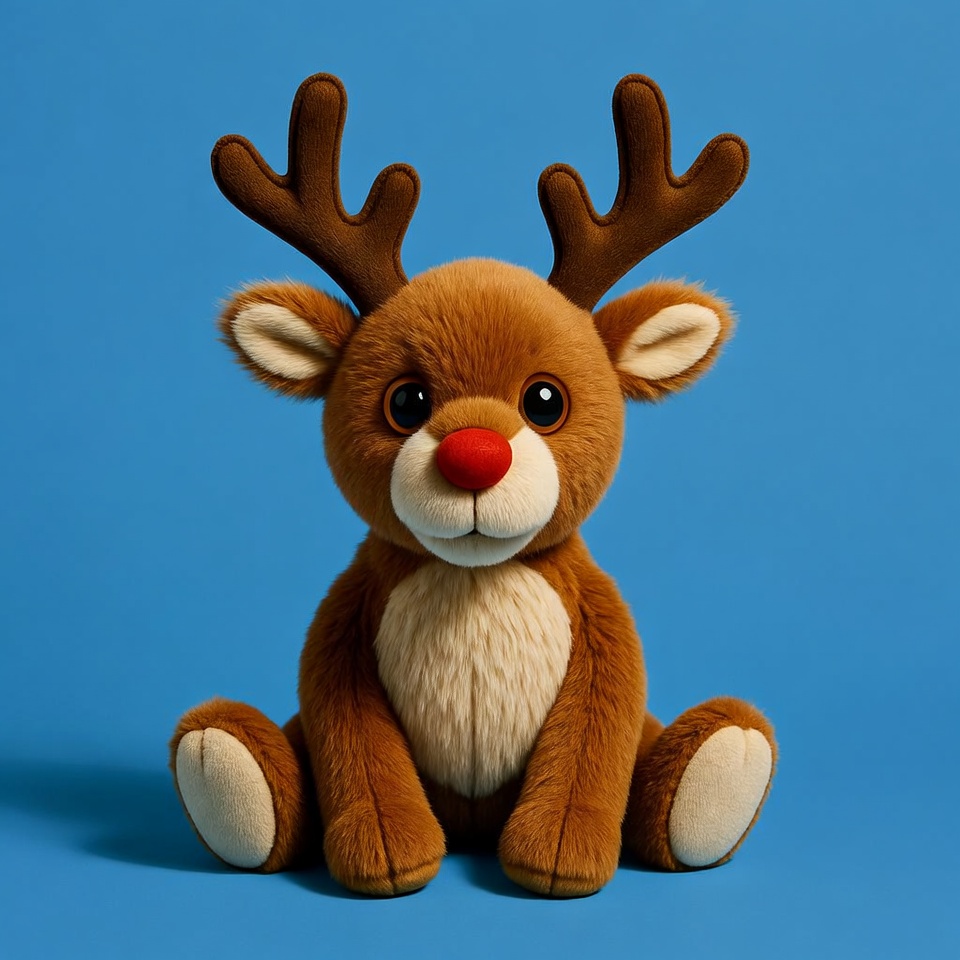A plush toy resembling Rudolph the Red-Nosed Reindeer sits on a solid blue background. The brown stuffed reindeer has large antlers, shiny black eyes, and a prominent red nose. Its fluffy fur and smiling expression give it a cute, endearing look.