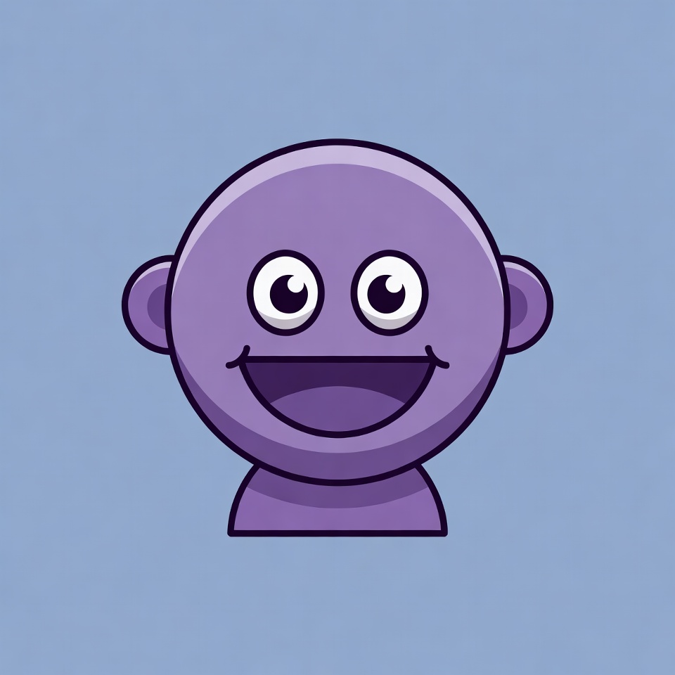 A simple purple cartoon face with large white eyes and a wide smiling mouth is centered on a light blue background. The illustration features bold black outlines and minimal details. It has small rounded ears and a short neck.