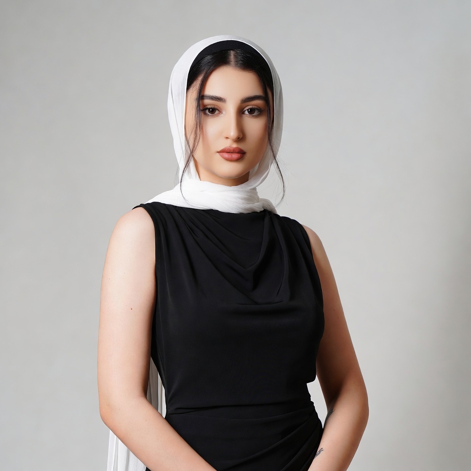 A young Middle Eastern woman with dark hair stands against a plain gray background. She wears a white hijab draped over her head and shoulders with loose strands framing her face, paired with a sleeveless black dress. Her expression is calm and direct as she faces the camera.