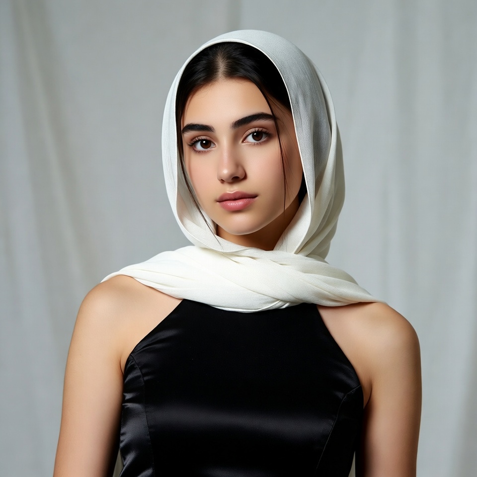 A young woman with dark hair and olive skin wears a white hijab draped over her head and shoulders. She has expressive brown eyes and a subtle expression, standing against a plain white background. She is dressed in a black sleeveless top with a halter neckline.