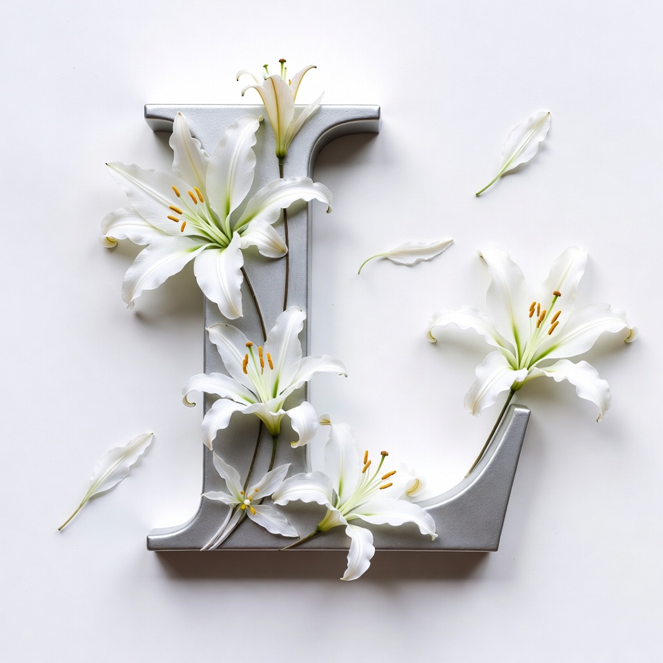 White lilies and petals are arranged to form a large silver letter L on a plain white background. The flowers bloom prominently around the edges and curves of the letter. Scattered petals add a natural, floating effect.