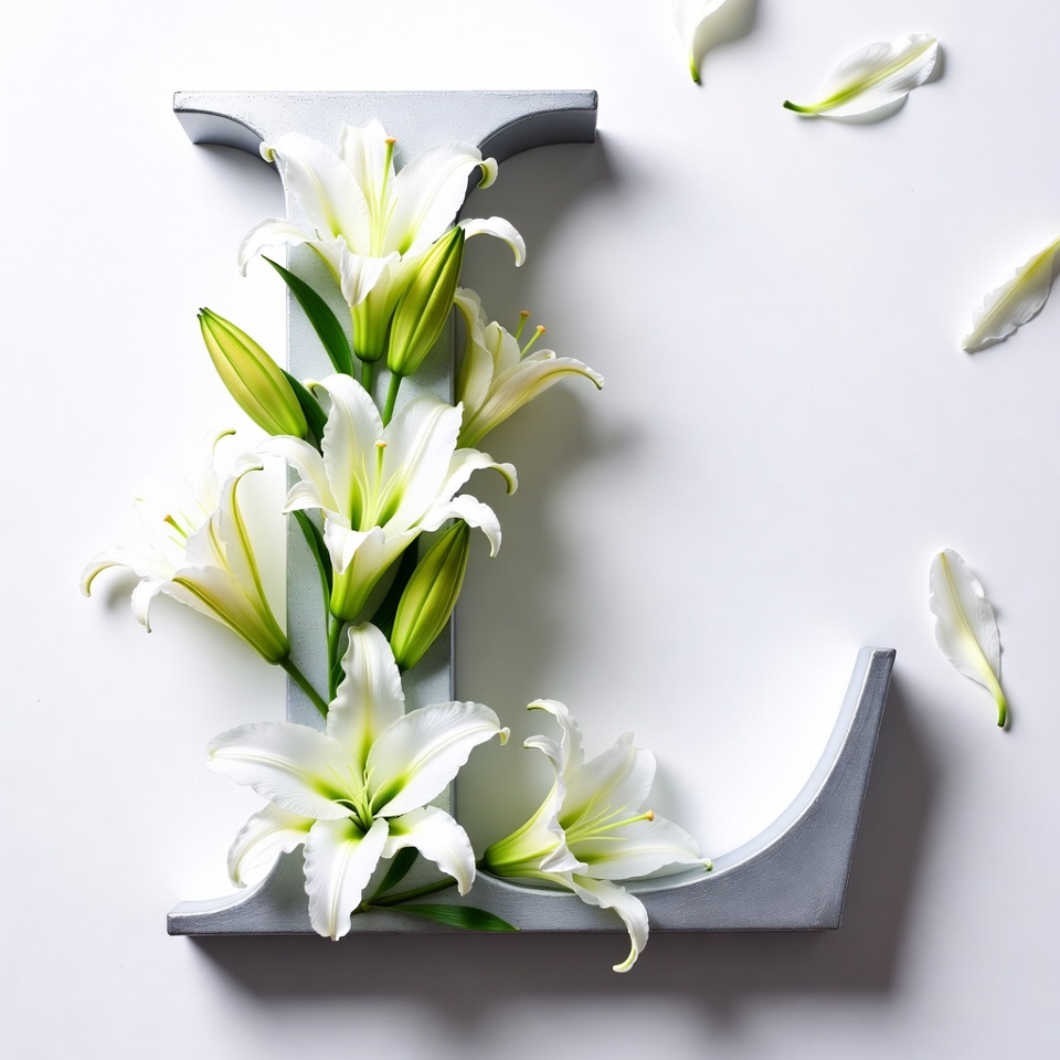 White lilies arranged to form a large gray letter L on a white background. Petals and stems create the floral design of the letter. Scattered white petals float around the composition.