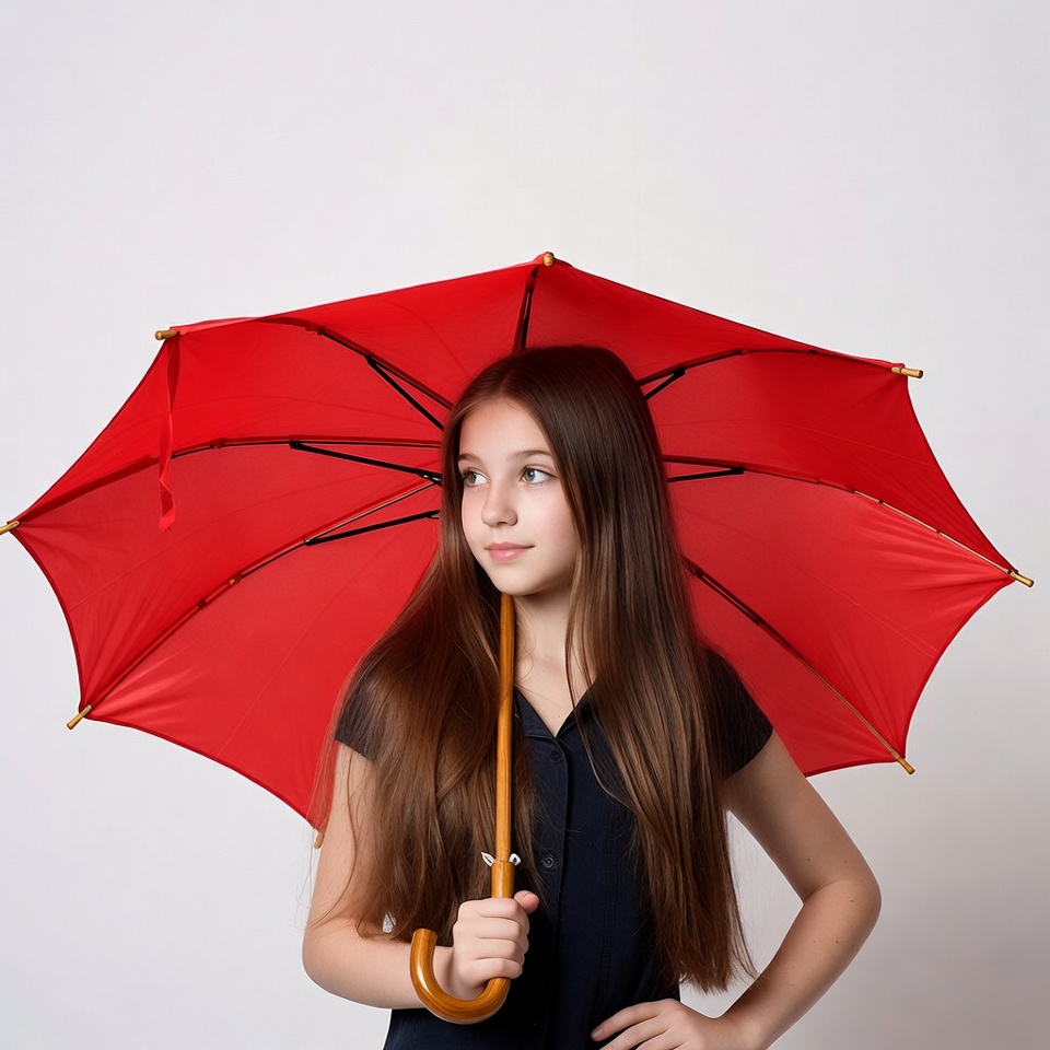 A young girl with long brown hair holds a red umbrella over her head against a white background. She wears a dark sleeveless top and stands with one hand on her hip, smiling softly. The wooden handle of the umbrella is gripped in her right hand.