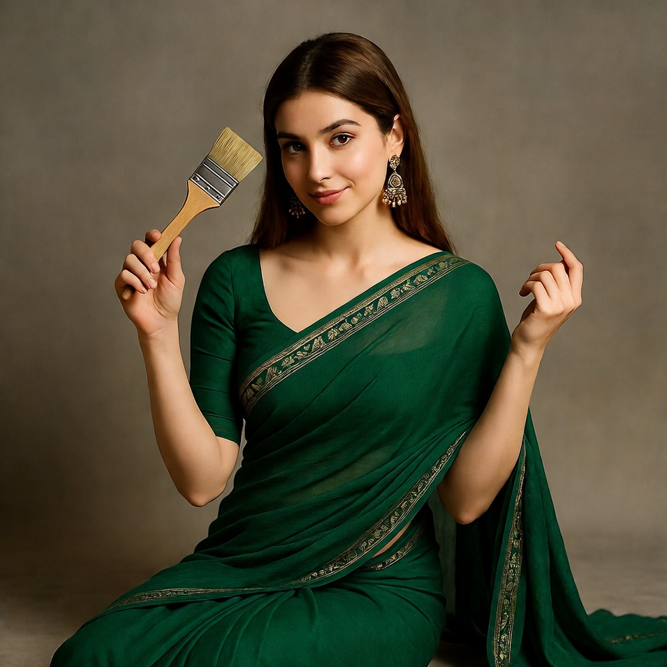A young Indian woman with long brown hair and earrings smiles while holding a white paintbrush in her right hand. She wears a green embroidered saree with a sleeveless blouse and sits on a plain beige background. Her left hand is raised gracefully near her face.