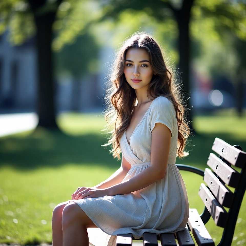 A young woman with long wavy brown hair sits on a wooden bench in a sunny park. She wears a light off-shoulder beige dress and gazes softly ahead. Lush green trees and grass surround her in the background.