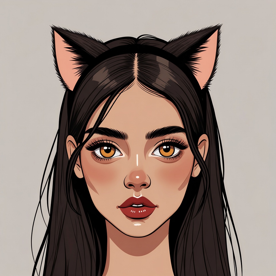 Asian, anime style, beauty, black ears, cat ears, cat headband, cute, dark hair, digital illustration, face, female, fluffy ears, girl, isolated background, kawaii, long hair, makeup, portrait, red lips, yellow eyes, young woman, woman