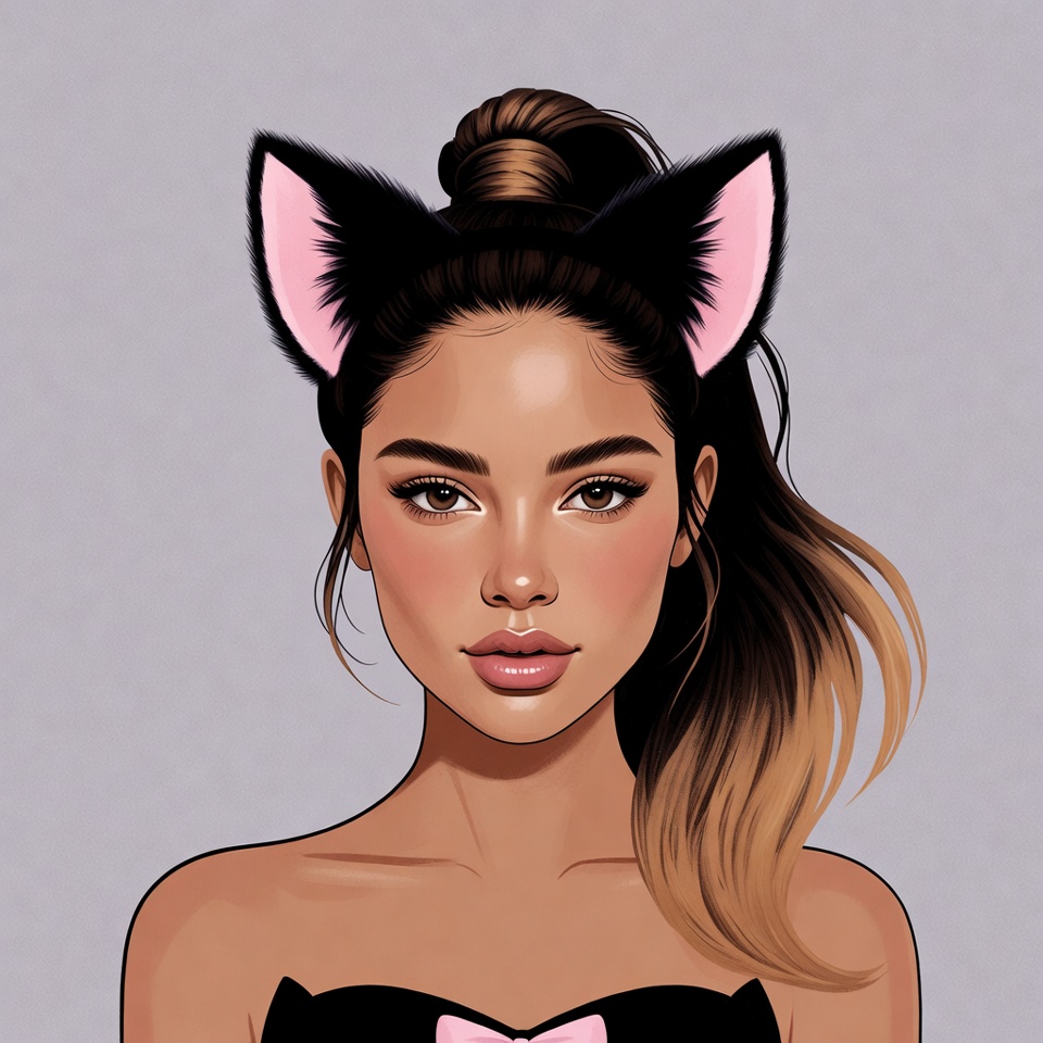 A digital illustration of a young woman with brown skin and wavy brown hair styled in a ponytail. She wears large pink cat ears on her head and has glossy lips and defined makeup. She faces forward against a plain gray background.