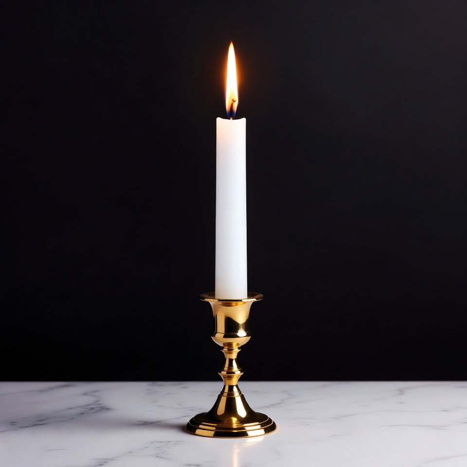 A white candle with a bright flame sits in an ornate gold candlestick on a marble surface. The candle is centered against a solid black background, highlighting the glowing flame and metallic details. The marble table reflects subtle light from the candle.