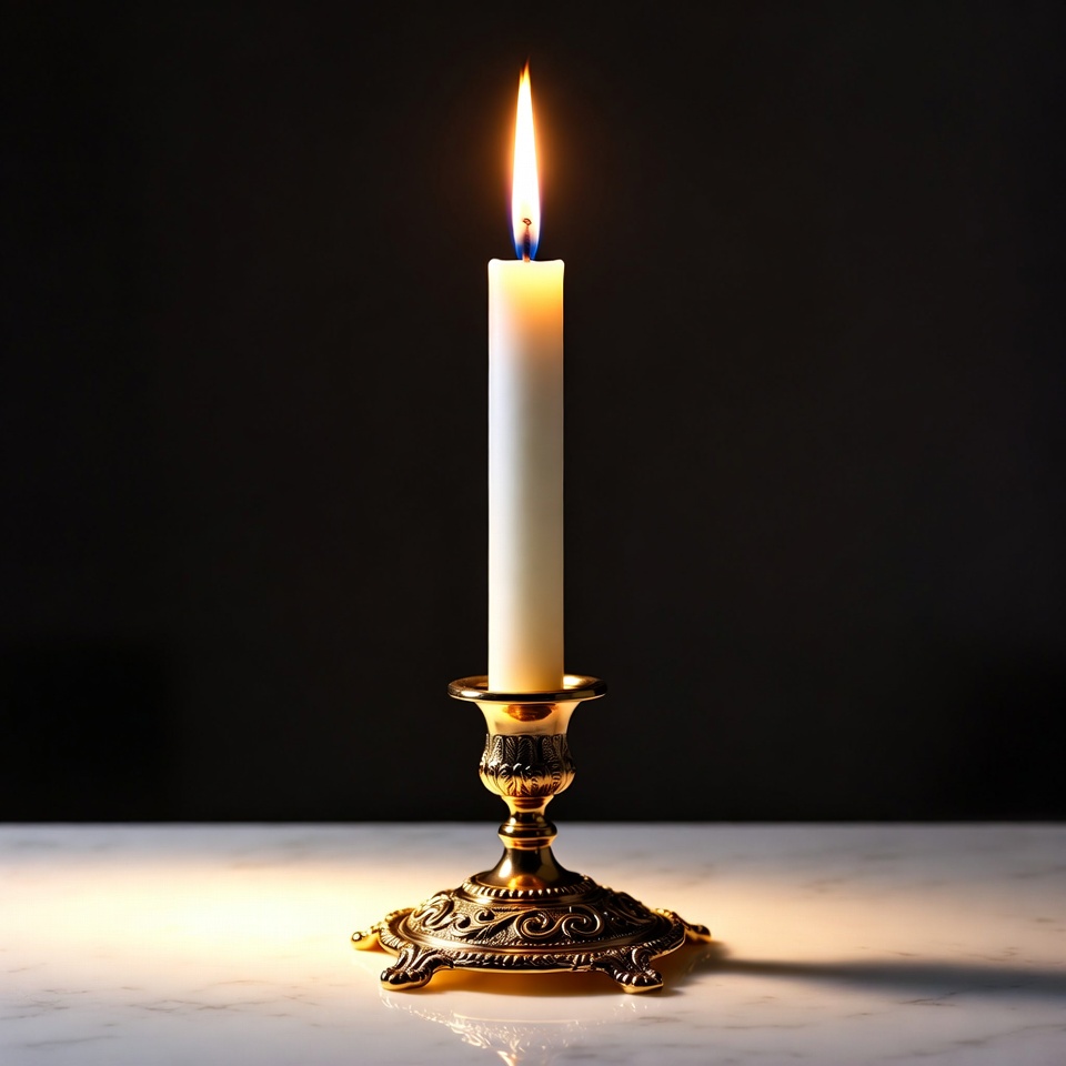 brass candlestick, burning candle, candlelight, candlestick, fire, flame, gold holder, isolated background, lit candle, marble surface, ornate candlestick, taper candle, warm light, white candle, wick, candle