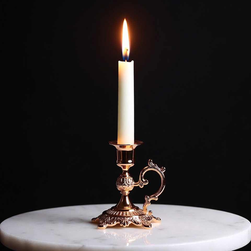 A white candle with a bright flame burns steadily on an ornate gold candlestick. The candlestick features intricate decorative patterns and a handle, placed on a white marble surface. A black background highlights the warm glow of the flame.
