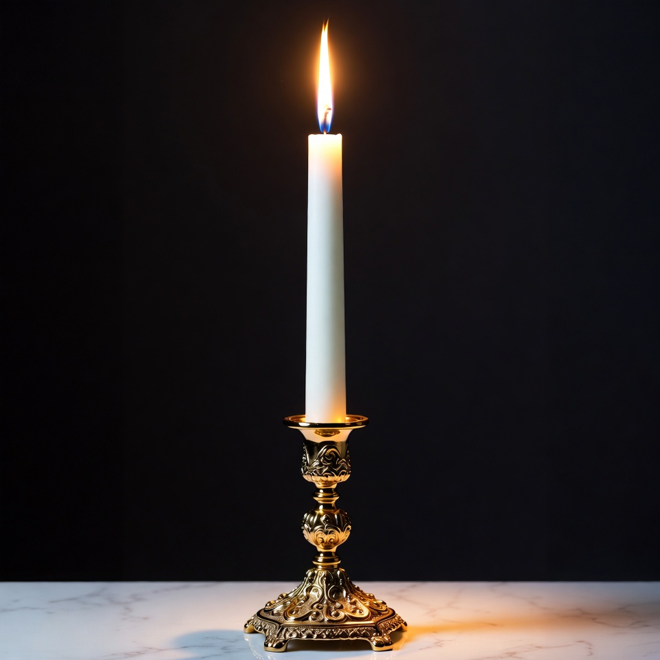 brass holder, burning candle, candle holder, candlestick, dark background, decorative candle, fire, flame, gold candlestick, isolated background, lit candle, marble surface, ornate candlestick, taper candle, vintage candle, wax candle, white candle, candle