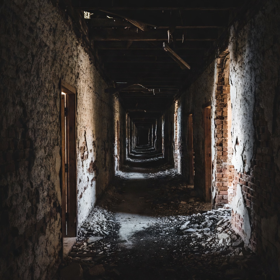 atmospheric lighting, broken windows, corridor, crumbling plaster, dark interior, debris, decay, derelict, empty hall, exposed beams, hallway, isolated background, narrow passage, old structure, ruined walls, urban exploration, vintage architecture, wooden doors, abandoned building