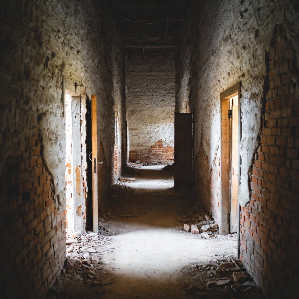 abandoned building, architecture, brick walls, concrete floor, debris, decay, derelict interior, dim light, empty hallway, exposed beams, long corridor, old building, open doors, plaster walls, rubble, ruins, shadows, urban exploration, wooden doors, abandoned hallway