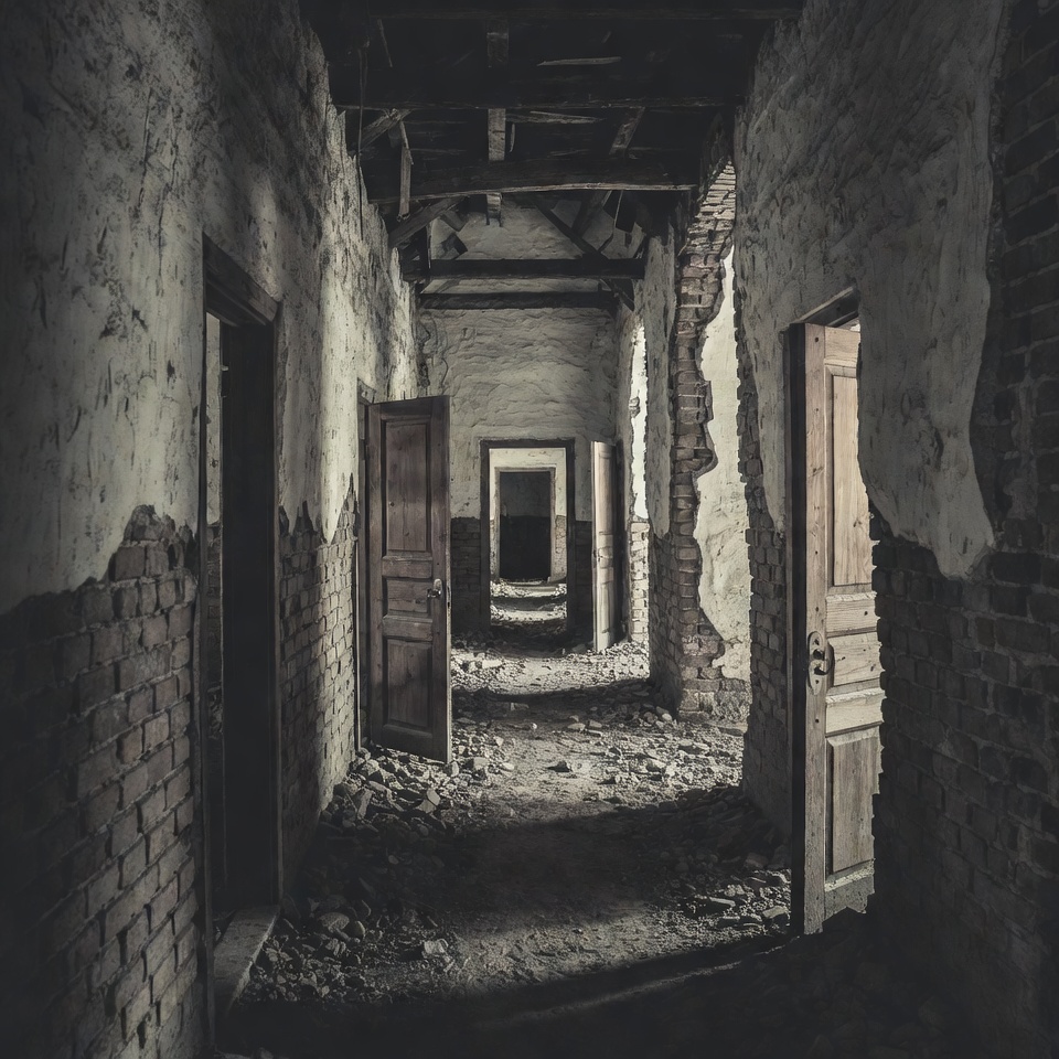 abandoned building, arched ceiling, atmospheric ruin, brick walls, broken walls, crumbling plaster, dark interior, debris floor, decayed building, derelict passage, dilapidated walls, dim lighting, eerie corridor, empty hallway, exposed beams, forsaken interior, monochrome tones, old structure, open doors, peeling plaster, ruined corridor, rustic beams, shadowy hallway, stone walls, urban decay, vintage architecture, wooden doors, abandoned hallway