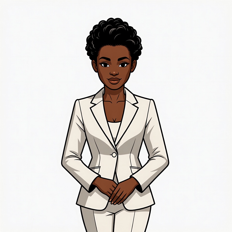 A cartoon illustration of an African-American woman with curly black hair stands confidently on a white background. She wears a white blazer over a white top and matching pants, with her hands clasped in front. Her expression is calm and professional.