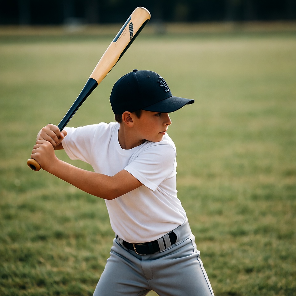White, baseball bat, baseball field, baseball player, batting stance, black cap, gray pants, green grass, male, outdoor, sports, swinging bat, trees background, white t-shirt, wood bat, young boy, youth baseball, boy