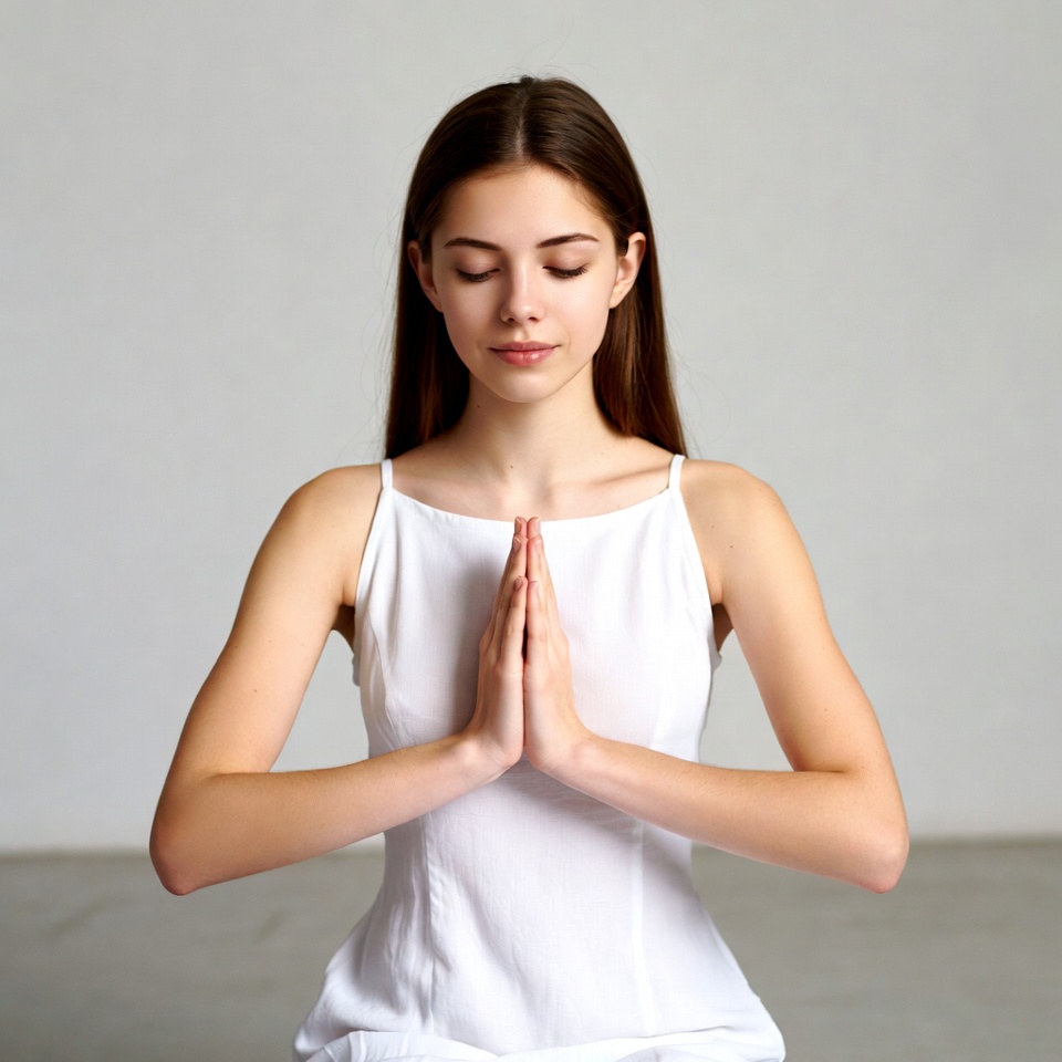 A young woman with long brown hair sits cross-legged wearing a white spaghetti strap top against a plain gray background. She presses her palms together in a prayer gesture at chest level with eyes closed. Her serene expression and relaxed posture convey meditation.