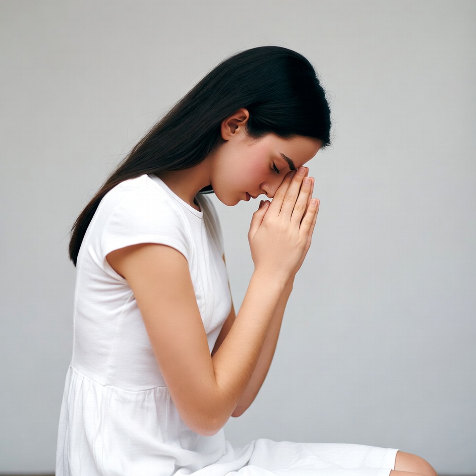 A young woman with long straight black hair sits on the floor wearing a white short-sleeved dress. She has her eyes closed and hands pressed together in a praying gesture in front of her face. The background is plain gray.