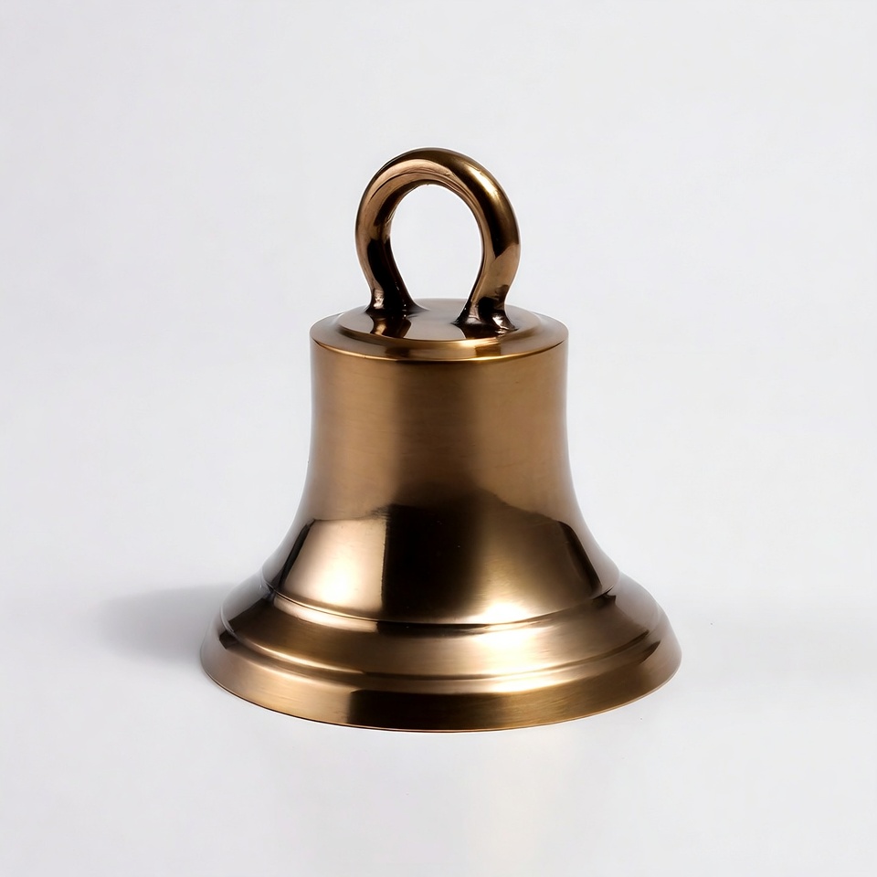 A polished bronze bell with a curved handle sits on a plain white background. The bell features a shiny metallic finish and a flared base. It is centered and isolated for clear visibility.