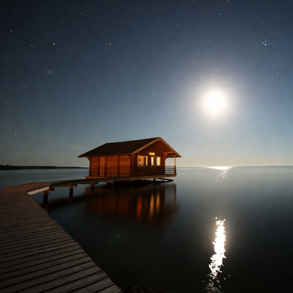 cabin on water, calm lake, dock, full moon, lake, landscape, lit windows, moon reflection, moonlight, night landscape, night sky, pier, reflection, serene water, starry night, stars, water, wooden house, wooden pier, wooden cabin