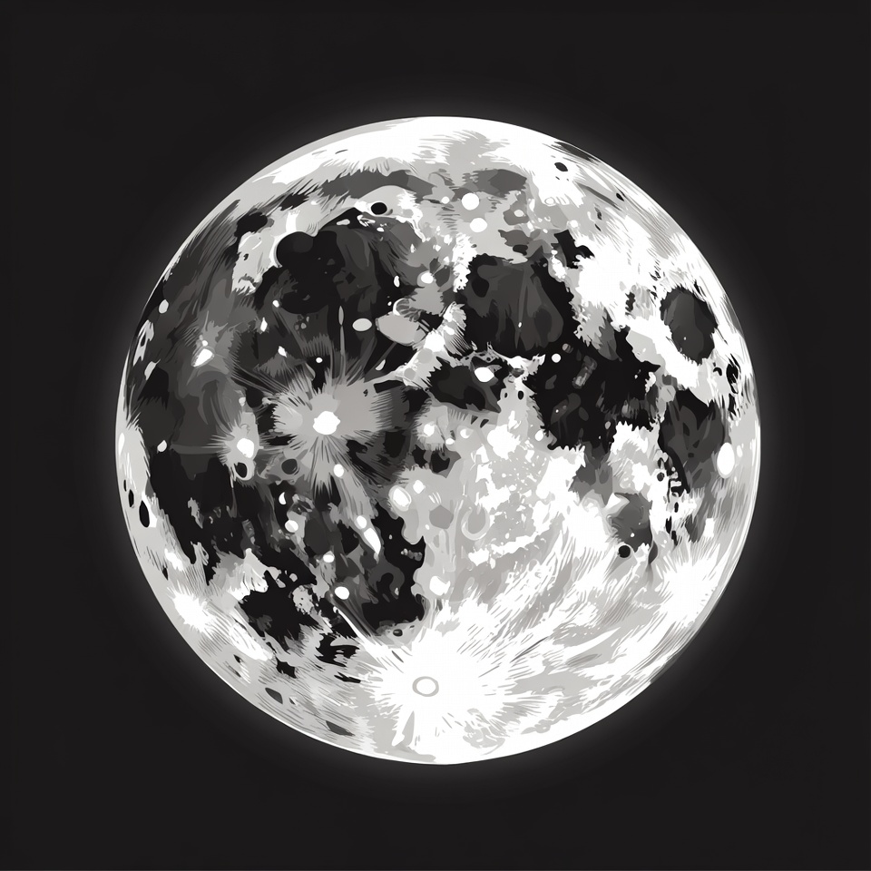 A detailed digital illustration of a full moon with craters and glowing highlights against a solid black background. The moon features textured dark spots and subtle radiating light rays. It is centered and isolated for a striking celestial effect.