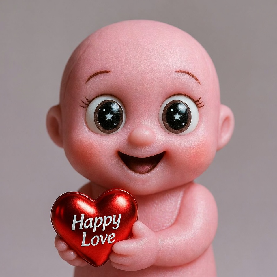 A cute pink baby figurine with big starry eyes and a smiling face holds a shiny red heart labeled 'Happy Love'. The bald baby has a smooth, glossy texture and stands against a plain gray background. The illustration features detailed anime-style features on the chubby baby doll.