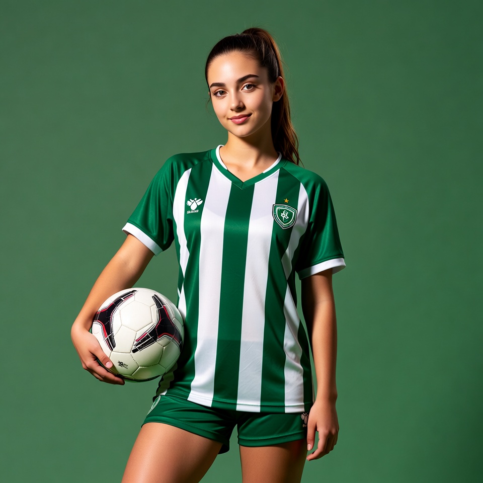A young woman with long dark hair in a ponytail stands confidently against a green background, holding a white soccer ball. She wears a green and white striped soccer jersey with a crest and matching green shorts. Her expression is smiling and athletic.