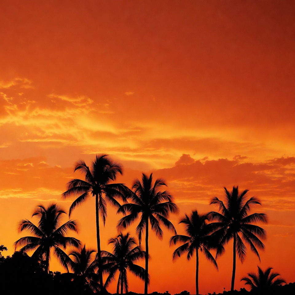 Silhouettes of tall palm trees stand against a vibrant orange sunset sky. The sky features scattered clouds illuminated in warm hues of orange and red. The scene captures a tropical landscape with multiple coconut palms in the foreground.