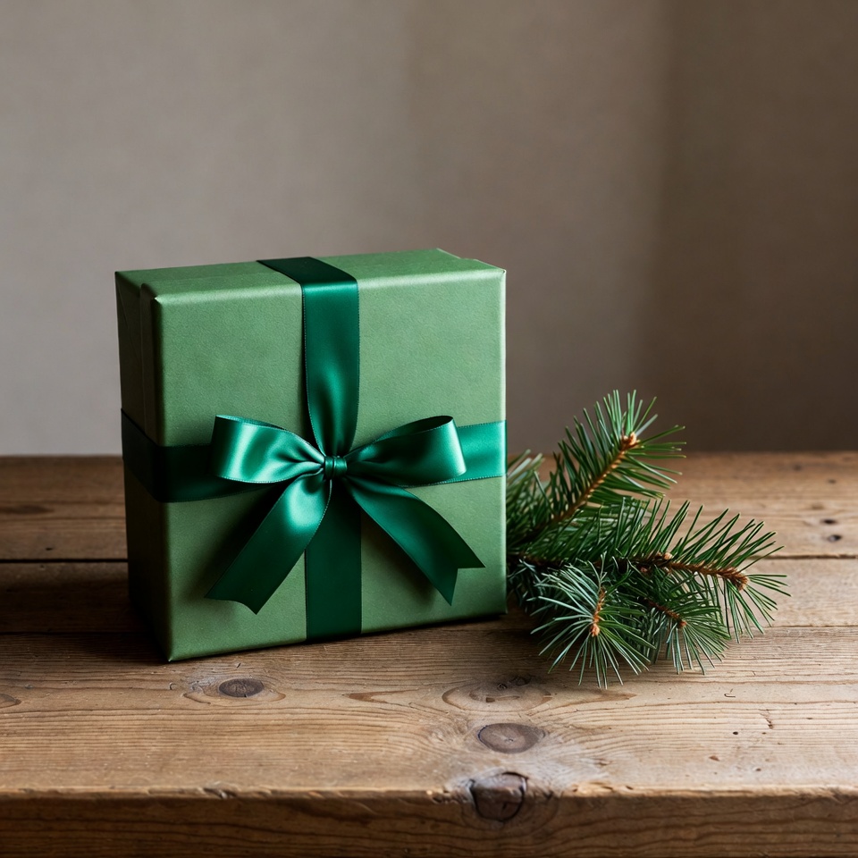 A green gift box wrapped with a matching green satin ribbon and large bow sits on a rustic wooden table. A small sprig of pine branches with needles lies beside it. The scene is set against a neutral beige background.
