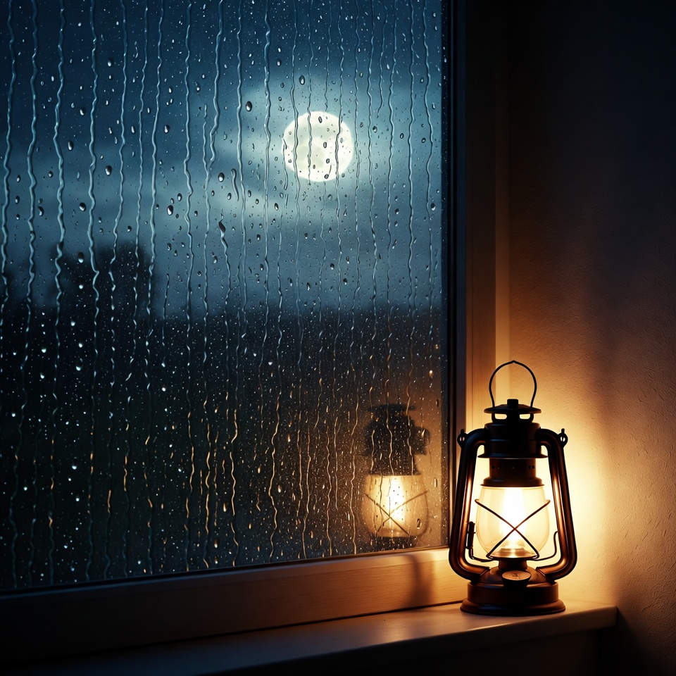 A window streams with heavy rain at night, revealing a bright full moon in the dark sky. A vintage oil lantern with glowing light sits on the windowsill, its reflection visible in the glass. The scene captures wet glass panes and a cozy indoor sill against the stormy night outside.