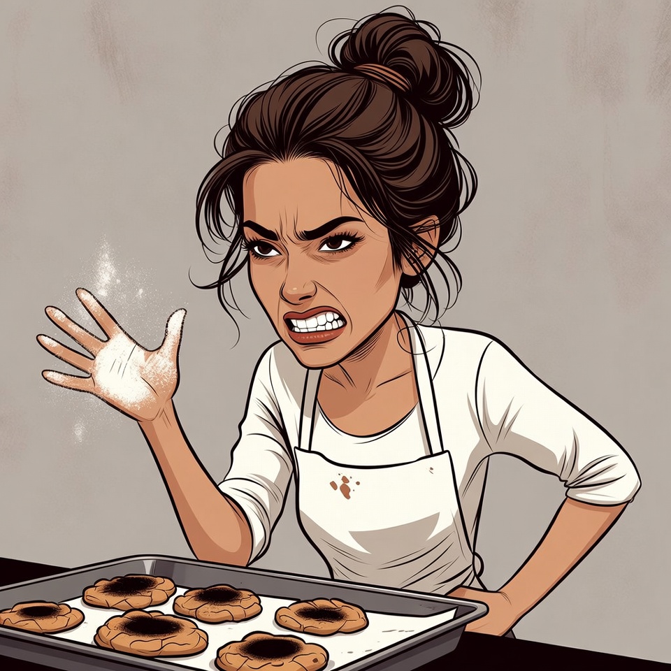 A cartoon woman with brown hair in a bun wears a white apron stained with flour and batter. She angrily sprinkles flour from her hand while glaring at freshly baked cookies on a baking sheet. Her expression shows frustration in the kitchen setting.