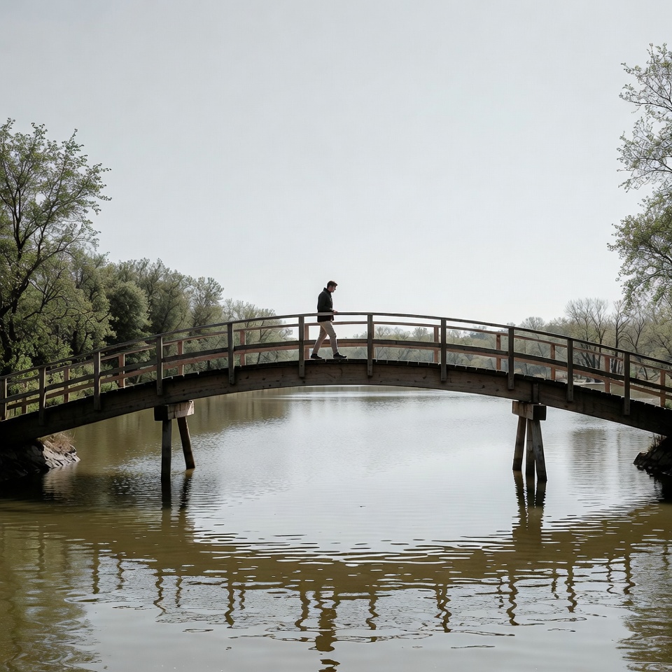 A man with short hair walks across a curved wooden bridge spanning a calm pond. Lush green trees line both sides of the water, with their reflections visible in the still surface. The bridge features sturdy wooden railings and supports.