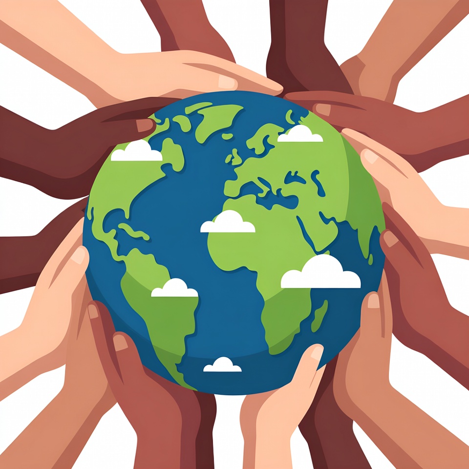 A vibrant illustration shows multiple hands of diverse skin tones gently cradling a detailed Earth globe. The globe features green continents, blue oceans, and white clouds against a plain white background. The hands form a circular arrangement symbolizing unity.