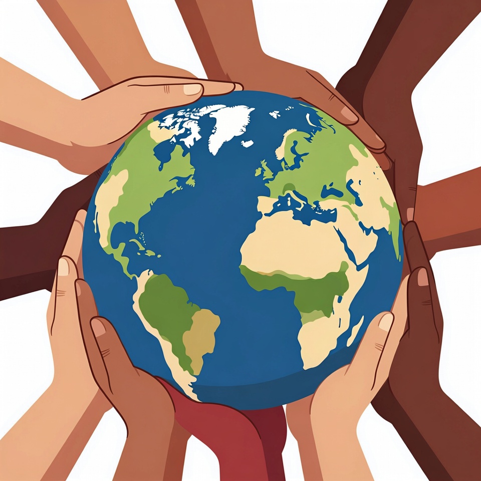 An illustration shows multiple hands of various skin tones collectively holding a detailed globe of Earth. The hands surround the planet from all sides against a white background. The globe features realistic continents, oceans, and polar ice caps.