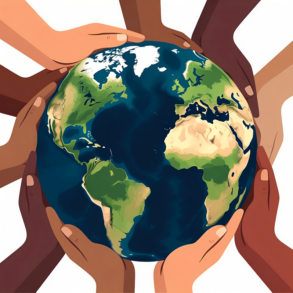 A colorful illustration depicts diverse hands of various skin tones gently holding a detailed globe representing Earth. The planet shows continents like North America, South America, Africa, Europe, and Asia with blue oceans and green landmasses. The hands surround the Earth completely against a white background.