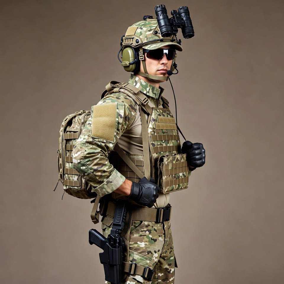 A male soldier stands in full tactical camouflage uniform against a beige background. He wears a helmet with night vision goggles, sunglasses, gloves, and carries a backpack and holstered pistol. His gear includes a plate carrier, radio mic, and protective earpieces.